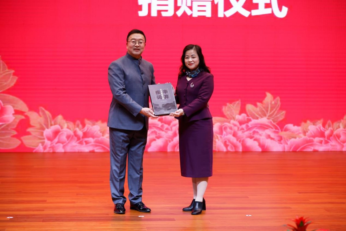 方宏建教授向学校赠送《辛弃疾词·艺术歌曲》专辑,副校长单成娟代表学校接受捐赠